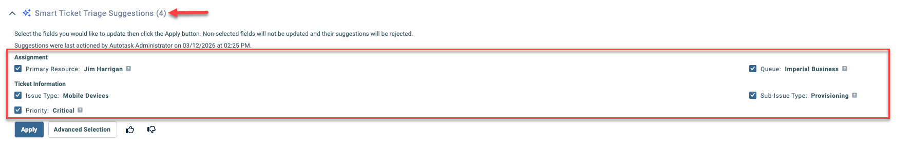 In some cases, you may notice that the number of suggestions displayed in the Ticket Triage Suggestions section appears lower than expected. This can be confusing if you know more fields contain suggestions than what the section header indicates.
