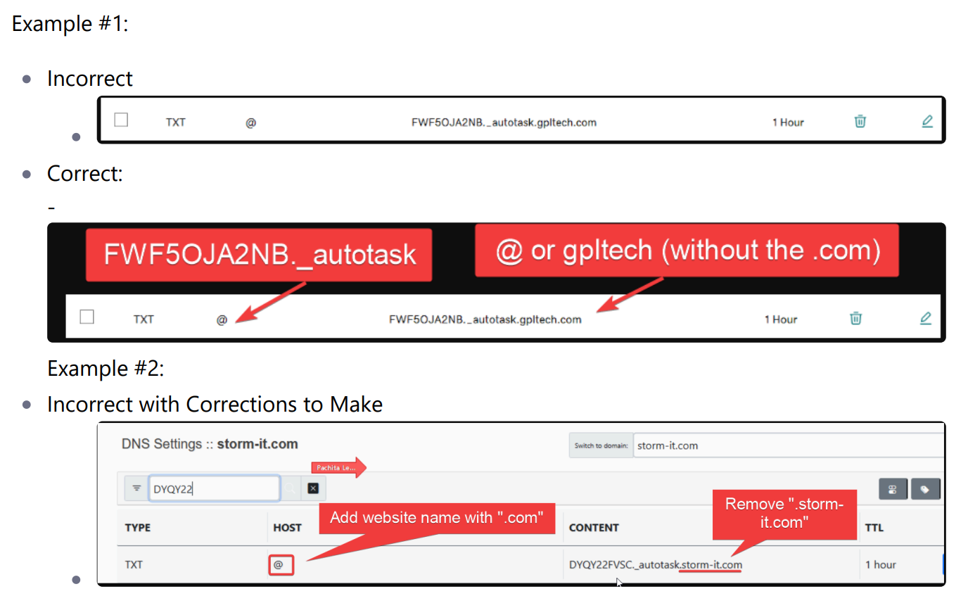 Below are examples from popular DNS providers demonstrating correct and incorrect methods for entering information to validate and authenticate domains in Autotask PSA.