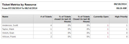 Various ticket metrics, sorted by resource, for tickets received in the selected date range. |