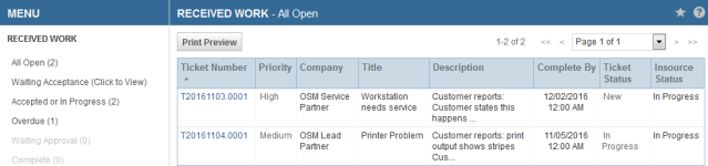 Accepted or In Progress | Tickets accepted or in progress, that is, accepted by the service partner and not yet completed. |