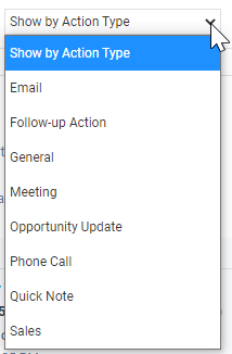 On the Organization and Contact activity feed, you can filter the notes and to-dos by action type. The dropdown will list active action types in ascending alphabetical order.