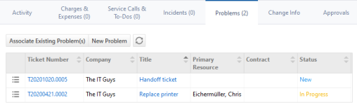 On the Problems tab of change request tickets, you create and manage associated problems. To open the page, use the path(s) in the Security and navigation section above.