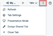 You manage the currently selected tab from the tab menu. Menu options will depend on whether the tab is a personal tab (one you created or copied), or one that was shared with you.