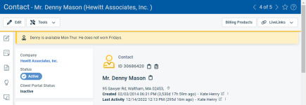 On the Contact Alerts tab, you can configure messages that will appear as alerts on several Autotask pages for the specific contact only.