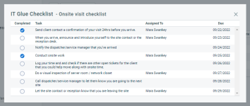 - Once established, you can open IT Glue checklists in Autotask or IT Glue, and complete checklists and individual tasks.