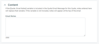Email Notes | The Email Notes field appears on both the Publish and Quote Settings pages. You can use the Email Notes field to add personal comments or additional organization specific information to a quote email message when using an email message template. The content of the Email Notes field also provides the content for the Quote: Email Notes variable. Insert the Quote: Email Notes variable into the desired location in the email template. When you publish the quote, the content in this field will replace the Email Notes variable. TIP You can override the content of this field when you publish a quote. The Publish page also contains an Email Notes field. Content you enter in that field will override the content specified here for the published quote only. Refer to Publishing a quote. |