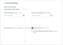Quote Email Message | Select the email message template to use for notifications that are sent when a quote is published. TIP Message templates can either provide a URL link to view the quote, or include a PDF copy of the quote. Refer to Adding or editing email message templates for invoices or quotes. |