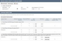 Click the Auto-populate "Now Receiving" button above the table to populate the Now Receiving column with the difference between Ordered and Previously Received quantities for all rows. NOTE If you selected items on the Receiving page and then clicked the Receive Full/Partial button to open the Receive/Cancel Receipt of Purchase Order page, the Auto-populate "Now Receiving" button will only populate the Now Receiving column for the items that you selected on the Receiving page. |