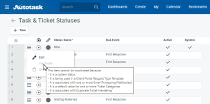 NOTE The system statuses New, Waiting Customer, and Complete, and statuses associated with your Autotask Add Ticket Email Service and Duplicate Ticket Handling setup cannot be inactivated or deleted.