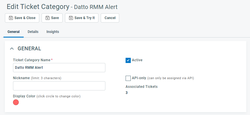 Or, select Edit from the context menu of a category in the list and edit that category. - Complete the fields and settings on each of the three tabs: General, Details, Insights. Refer to