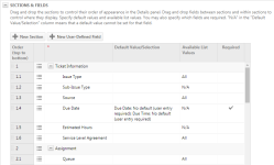 In the Sections & Fields table, you create the sections that will appear on the Details panel, and then add fields to the sections. You can create up to 20 sections, but there is no limit to the number of fields in a section.