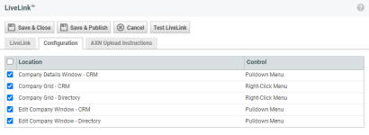 On this tab, you select the locations where the LiveLink will appear. The available Location choices are specific to the entity associated with the LiveLink. LiveLinks that are not associated with an entity are added to the LiveLinks menu in the top navigation bar. When the LiveLink is published, it becomes available in the selected locations.