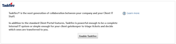 To set your client up with their own internal helpdesk, click Enable Taskfire. Refer to Configuring Taskfire for a client.