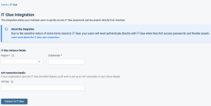 - Administrators can connect and disconnect their organization's Autotask instance from their instance of IT Glue. Refer to Integration setup.