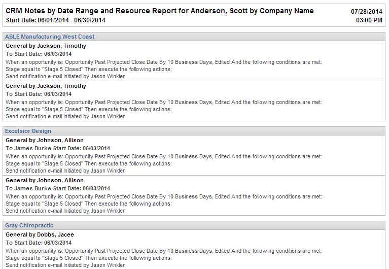 Old title: Call Summary. CRM notes, filtered by date range and resource(s). Sales Managers can use this to monitor sales activity. |