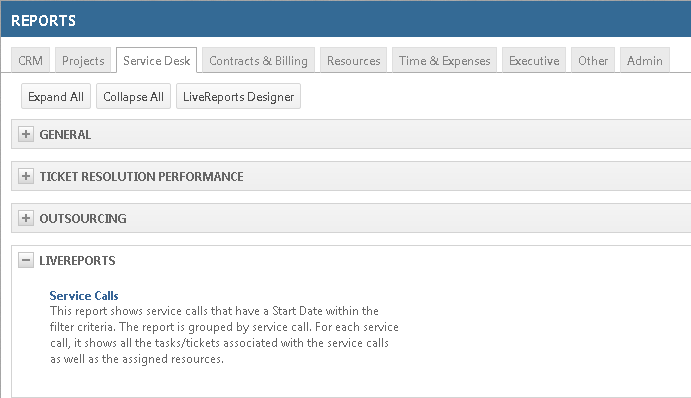 When you publish a LiveReport, Categories do not determine who can view a report, they determine only where users can access the report in Autotask. For example, a LiveReport published to the LiveReport Service Desk category appears under LiveReports on the Service Desk tab on the Reports page.