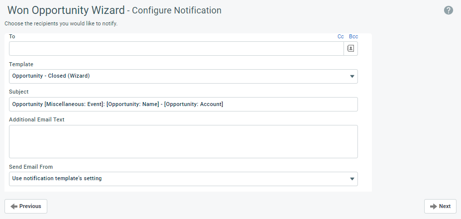 On this page, you choose the recipients you would like to notify that the opportunity has closed. For a description of the notification fields, refer to Notification panel.