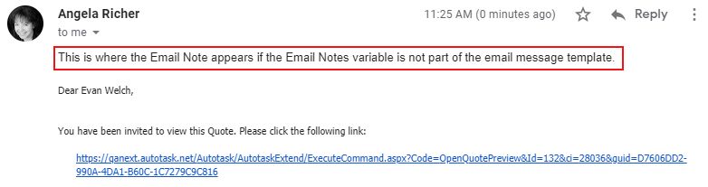 This field appears on the Quote Settings and Quote > Publish pages. It lets you add personalized comments or additional organization-specific information to a quote email message when you are using an email message template. The content of the Email Notes field also provides the content for the [Quote: Email Notes] variable. |