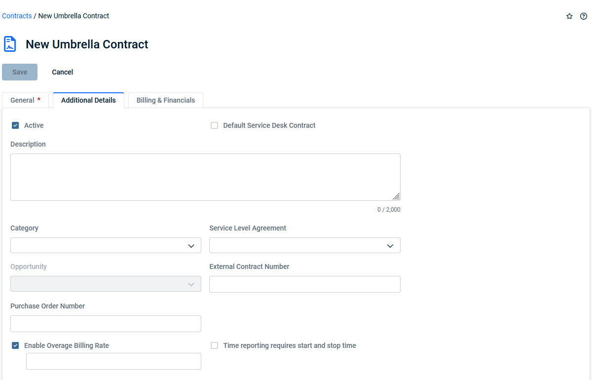 This tab lets you name the contract, link it to an organization and contact, set its start and end dates, and fill in any required custom fields. This tab must be complete before the contract can be saved.