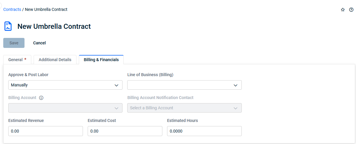 This tab allows you to specify the revenue you expect the contract to generate and configure settings for approving and posting labor.