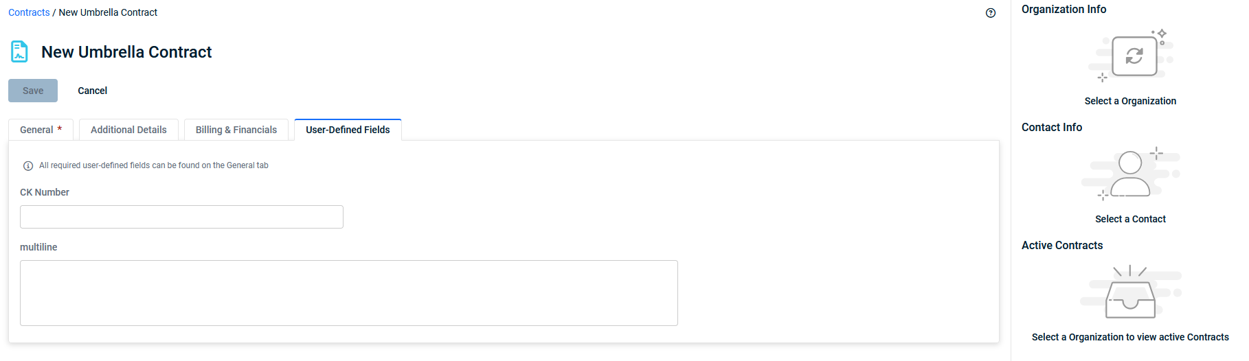 If your Autotask instance has one or more contract user-defined fields, the wizard displays those UDFs below the User-Defined Fields section. NOTE All required user-defined fields can be found on the General tab. User-defined FieldsUser-defined fields (UDFs) are custom fields set up by your Autotask Administrator that capture information that is unique to your business. They can be one of the following field types: