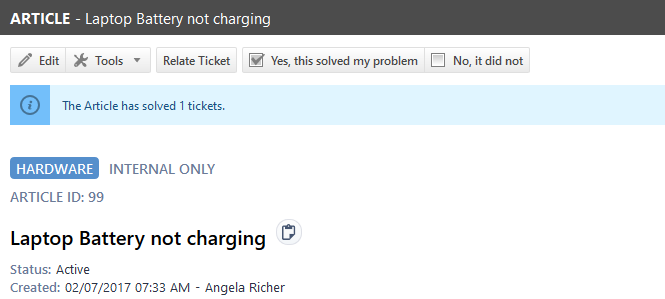 If you opened the article from the Suggested Solutions page and if the article was indeed a solution for the ticket, you have the option to relate the ticket to the article. Refer to Finding a solution from a ticket. |
