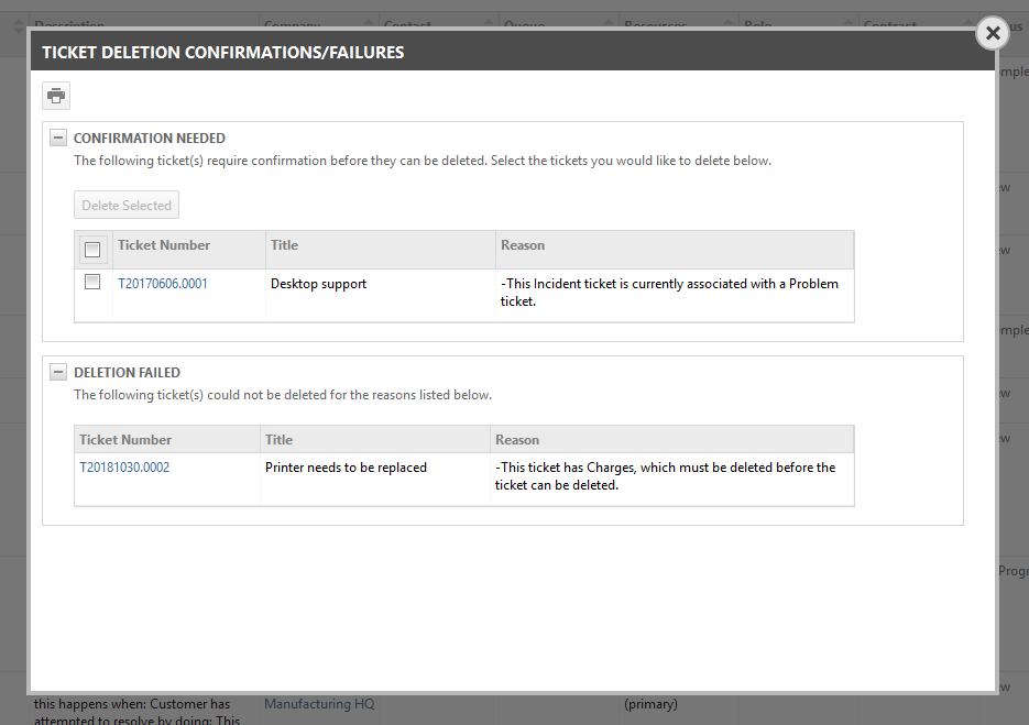 - If any tickets require additional confirmation or cannot be deleted before further action is taken, a second confirmation dialog will open.