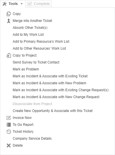 | Copy to Project | Copies the current ticket and associates it with a project as a task. Refer to Copying a ticket to a project. |