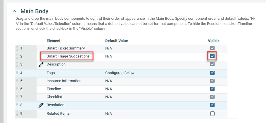 Review the desired Ticket Category to verify that the Main Body has the Smart Triage Suggestions component set to Visible. If Smart Triage Suggestions is not set to Visible, the Analyze Ticket button will not appear within a ticket. Refer to Main body for more information.