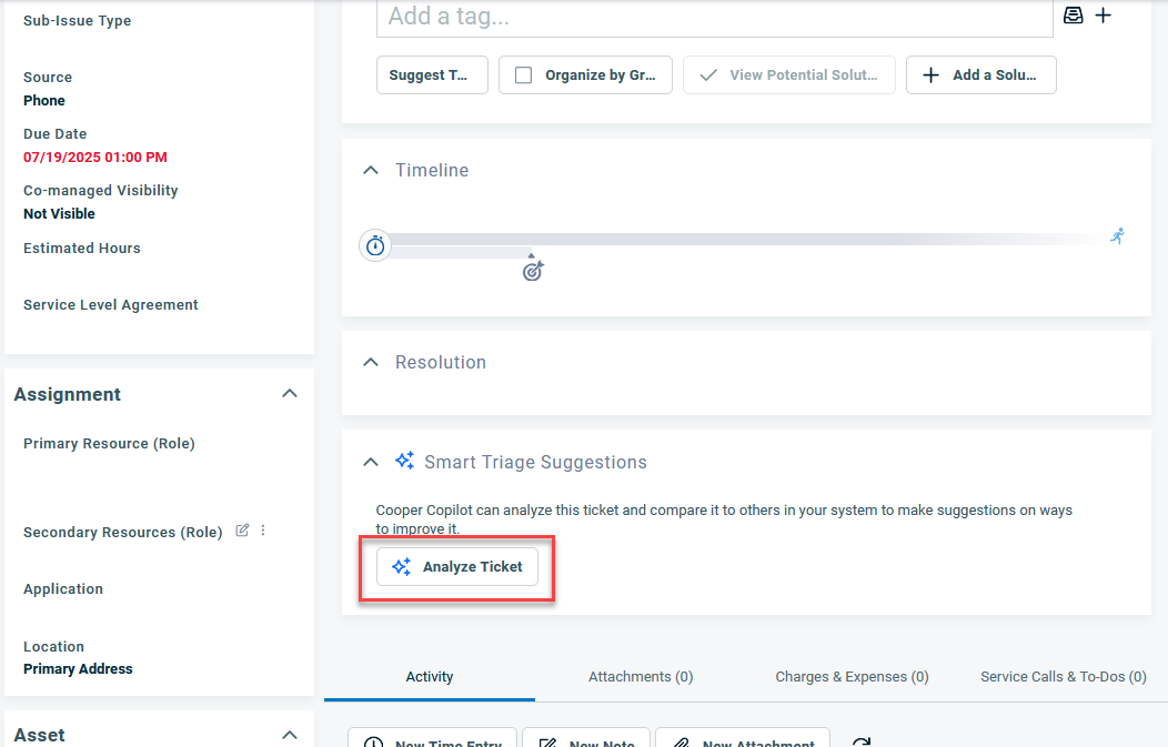 In the Smart Triage Suggestions field, click Analyze Ticket. Cooper Copilot analyzes similar tickets to suggest possible values for ticket fields.
