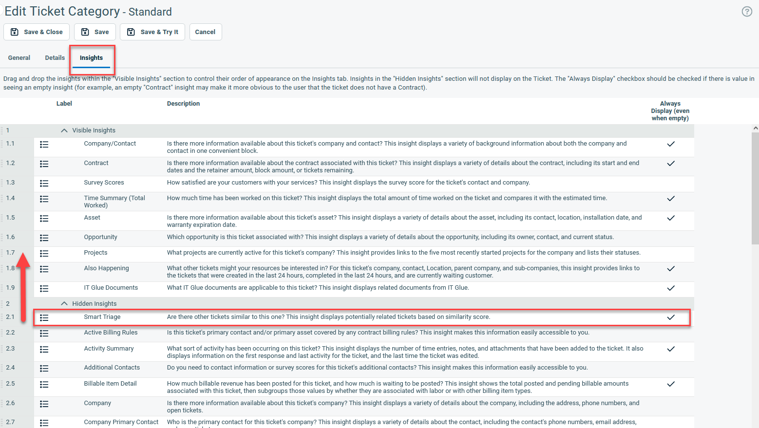 From the Insights tab of the same Ticket Category, verify that the Smart Triage insight is moved into the Visible Insights section. Refer to Display or hide an insight for a category for more information.