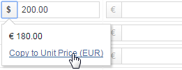 - If you click the currency indicator of the selected customer currency, the currency translation box will display the amount in your internal currency: Displayed Value = Field Value * Exchange Rate for selected customer currency.