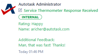 The Autotask service thermometer feature is designed to provide your customers with a feedback option that requires only 2 mouse clicks.
