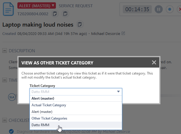 If your security level includes access to other ticket categories, you can view the ticket using a different category's layout without modifying the ticket's actual ticket category. This will give you access to fields that may be hidden on the original category.