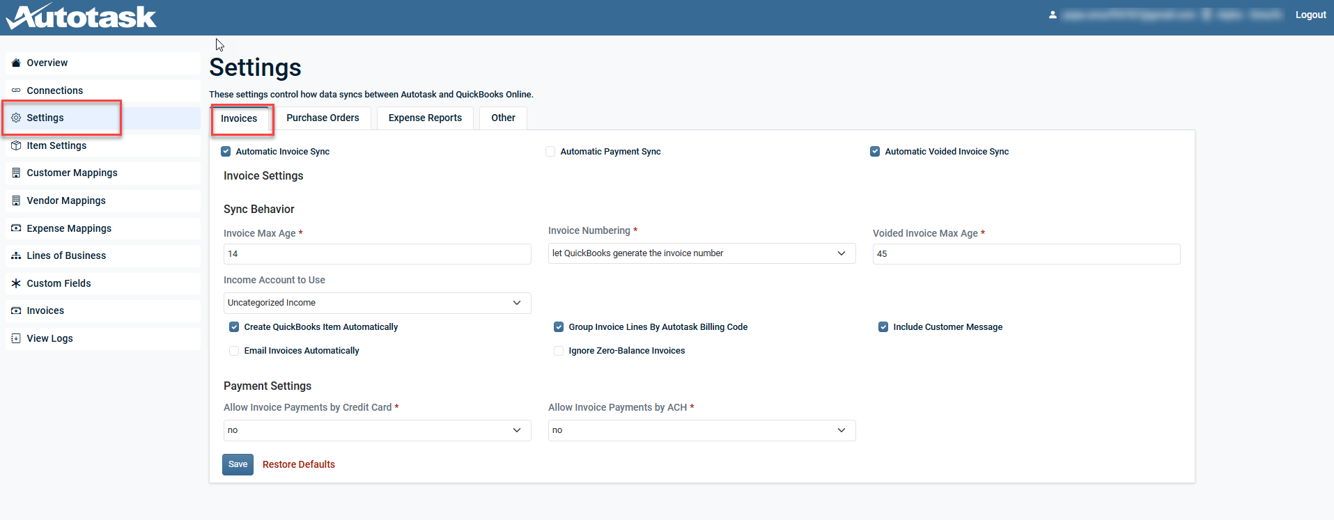IMPORTANT Enabling ConnectBooster’s surcharge feature with custom invoice numbering may cause invoice number conflicts or errors. To avoid this, disable invoice numbering in Autotask, allow the Smart Accounting Hub to let QuickBooks generate invoice numbers, and turn off custom numbering in QuickBooks Online. |