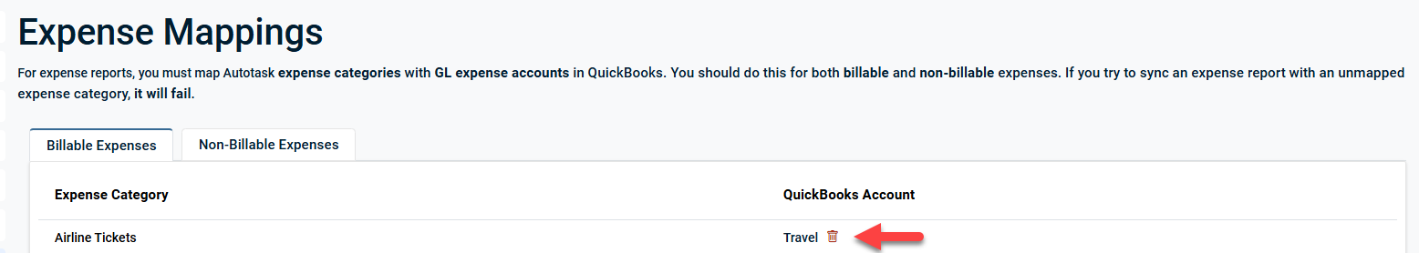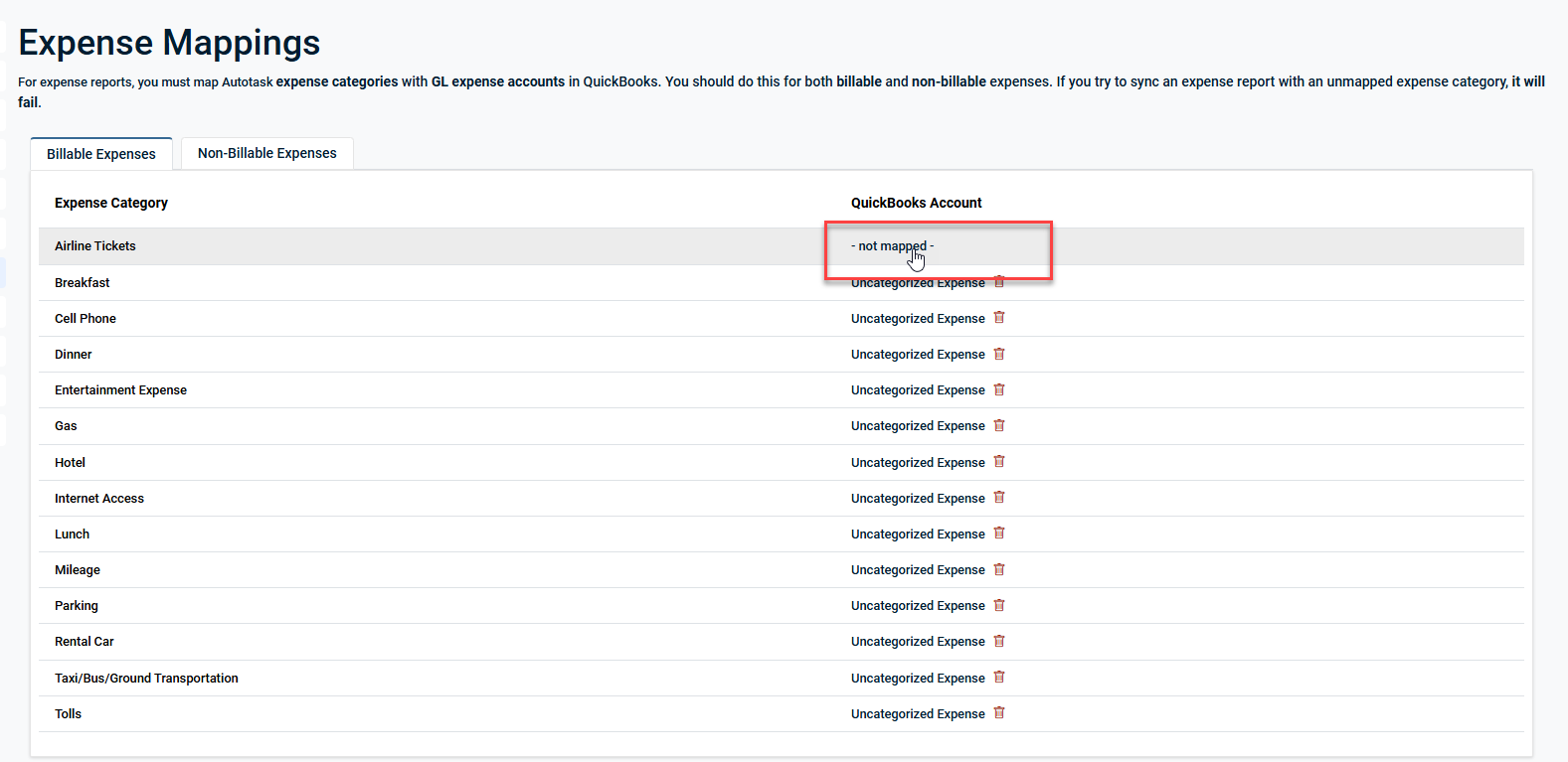 NOTE We recommend mapping both Billable (Reimbursable) and Non-Billable (Non-Reimbursable) Expenses. Unmapped Expense Categories will not sync to QuickBooks.