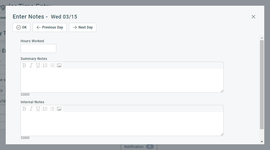 NOTE  To view summary notes of a regular time entry, you must change to the Report view of the timesheet and select Report Type > All Days, then scroll to the date.