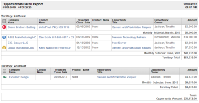This report provides the ability to review details on sales opportunities. Filtering is available on various items such as start date, status, territory, opportunity amount, and owner. The report is sorted by region and opportunity owner. |