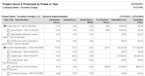 Estimated hours, actual hours, actual hours billed, % complete hours, extended cost, extended price and summary notes for the selected project at the task or phase level. |