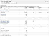 Financial details for the open project. View breakdowns and totals for expenditures, revenue, profit and projected revenue. In addition, the report also shows all tasks along with task status, estimated hours, hours worked, hours and amount posted and cost. Note that to appear on this report, fixed price contract milestones have to be associated with a project task or phase. Refer to Add or edit a milestone |