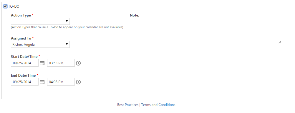 The To-Do option on the Contact Action page allows you to create a to-do and associate it with up to 2000 group contacts at once. Action types that have a view type of Calendar or Both (which means they display on the calendar or Dispatch Calendar) are not available.
