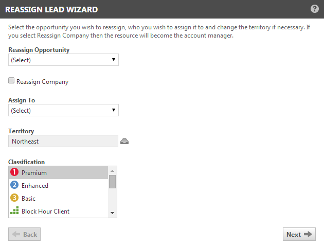 The Reassign Lead Wizard lets you reassign the Opportunity Owner, Account Manager, Territory, and Classification at the same time.