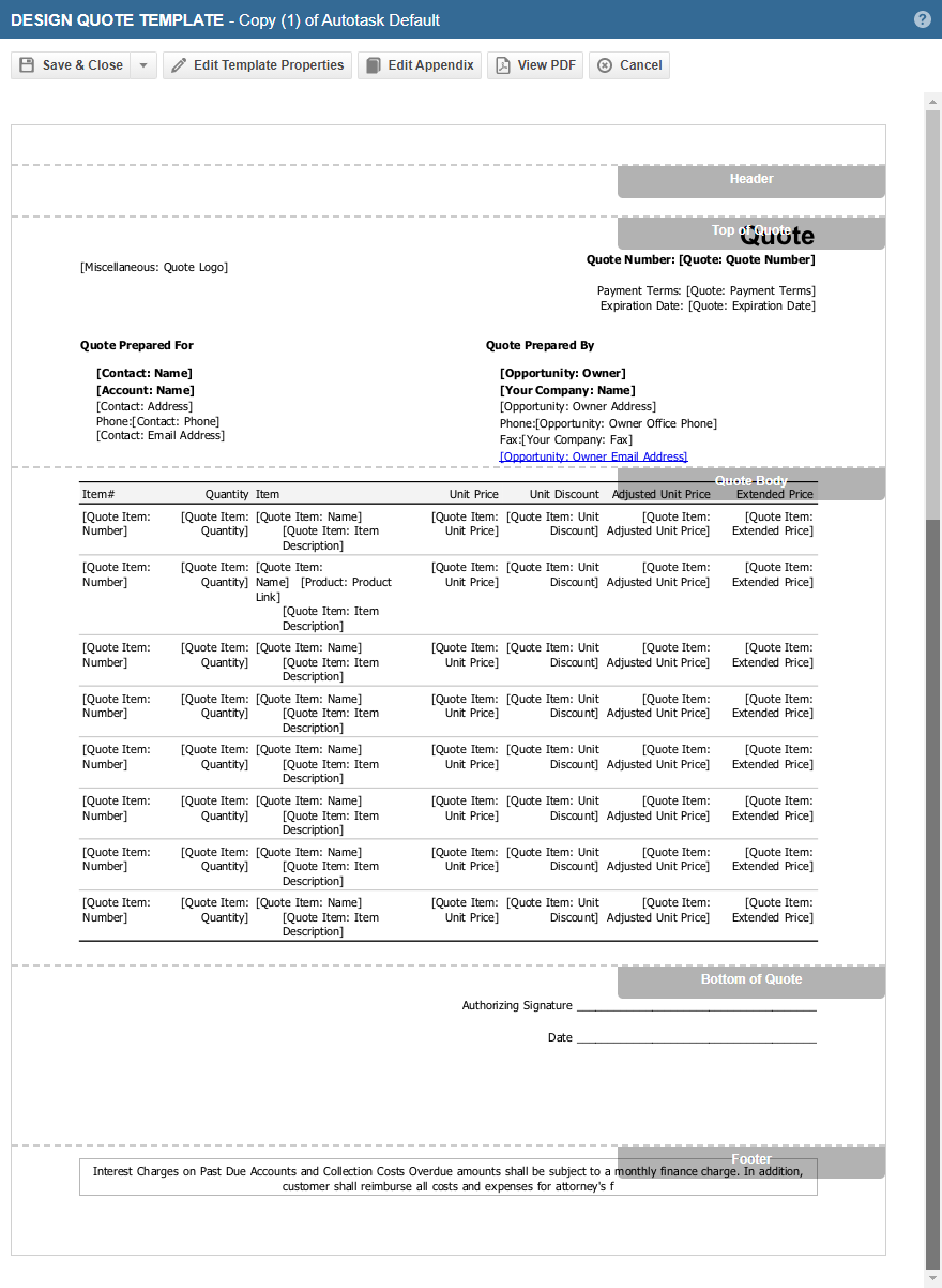 - To return to the main quote template, click OK. The template will show a preview of what the quotes will look like, with the variables displayed in brackets and text formatting applied.